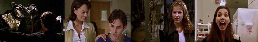 At school the following day, Buffy arrives late to Biology class. As she peers through the window of the door, Ms. French senses her presence and turns her head completely around to see her. Buffy is freaked and runs off. After Willow joins up with Buffy, they rush to the library to tell Giles about what happened. Buffy tries to convince them of what she saw, but neither believes her at first. Buffy then does some research and finds out that Ms. French is actually a giant preying mantis. Giles calls a friend he knew who encountered the same creature and finds that the only way to kill it is to dismember it. Buffy tells Giles to record bat sonar, which makes the preying mantis’ nervous system go to hell, while she heads off to go warn Xander.