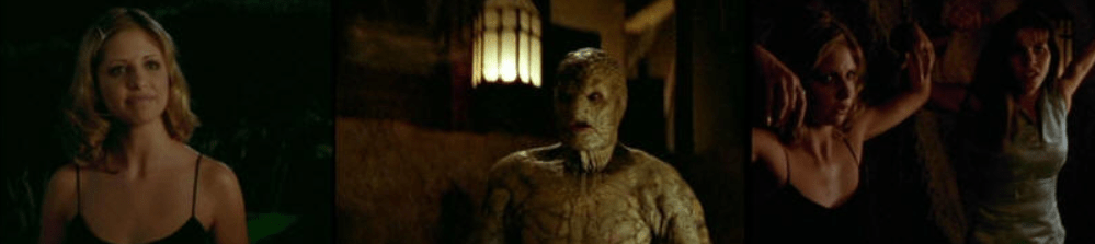 Willow, Angel and Giles head to the frat party and meet up with Xander. They all sneak into the house and beat up the frat guys. Buffy finally breaks free and fights with Tom. She knocks him aside and then uses his sword to cut the demon, Machida, in half. Cordelia is saved and all the frat guys are taken away to be arrested. Afterwards, everyone meets up at the Bronze. Angel appears and says he would like to have coffee with Buffy sometime. She plays it cool and says, “Sometime, I’ll let you know.”