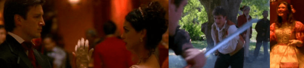 Atherton cuts into Mal and Inara’s dance, saying Inara is his because money has changed hands. Mal socks Atherton in the face. Atherton says he accepts Mal’s challenge to a duel. It will take place tomorrow morning. With a sword. Not Mal’s weapon of choice.