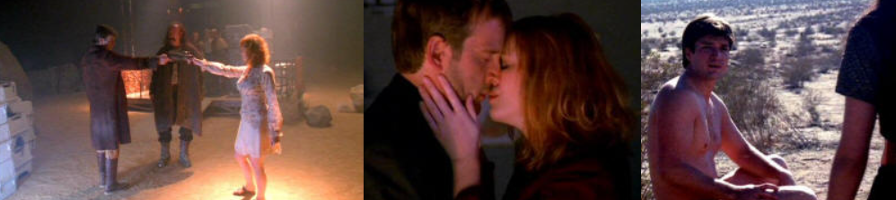 On Serenity, Wash, Zoë and Kaylee find that Saffron rigged it so they can’t turn and they are forced to land, delaying them from making it to the goods. Meanwhile Saffron has left a naked Mal somewhere in the desert and she has gone to look through the trash bin to find the Lassiter. She is having no luck as she goes through the bin. She looks up to find Inara, well dressed and sitting, aiming the Lassiter at her to try it out. She finds it doesn’t work, but she has her own gun, and she pulls it on her. Inara tells Saffron that the crew had been playing her all along. Inara then closes the lid to the trash bin, trapping Saffron inside to wait for the authorities to find her.