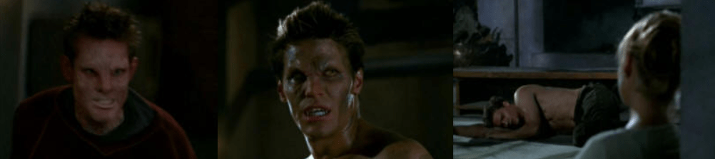 Pete yells at Debbie and then turns into a monster with veins popping out all over. Before he needed the substance to turn into the monster, but now, he can do it on his own whenever he gets mad. He hits Debbie several times and then when she’s cowering in the corner, he realizes what he’s done and apologizes, turning back into his normal, human face. She forgives him. In the library, Oz and the rest of the gang are relived to find out that the killer wasn’t Oz, but they are upset to know that even though Oz (and Angel for Buffy’s sake) are cleared, there is still a killer who kills even during the day.