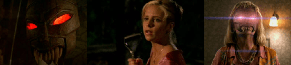 While everyone is fending off zombies, Pat wakes up, a full zombie now, and puts the mask on. She tries to eat Willow, but Buffy stops her and falls out of the window with Pat. While trying to avoid the hypnotizing glare of the Pat zombie, Buffy is knocked down. Back inside, Giles tells Oz to go and warn Buffy that she has to go for the eyes. As he’s about to, Pat catches Oz in her glare, but Buffy gets up and puts a shovel into Pat’s eyes, making her and all of the other zombies disappear.