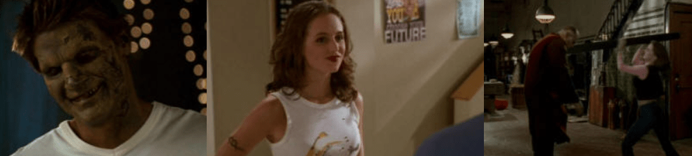 Buffy and Angel dance at the Bronze, and as they dance, Buffy’s Claddagh ring falls to the floor. Angel picks it up and holds it tight in his hand. Blood comes pouring from his fist, and then from his chest where she stabbed him. When she tries to help him, he tells her to go to Hell. Then, he changes into a dead corpse, laughs at her and tells her that he went to Hell. Buffy wakes up from this dream and Joyce tells her it’s time to go and face Snyder. At school, Principal Snyder has been forced to let Buffy back in and he gives her a huge list of things that she has to do before everything will be final, including passing tests from all of the classes that she missed last year.