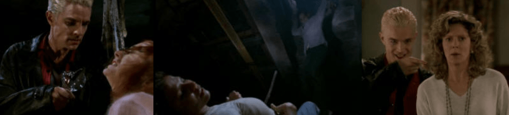 A huge fight ensues out in the streets of Sunnydale as Spike fights against the gang of vampires with the help of Buffy and Angel. After killing a few, they retreat back into the shop and barricade themselves in. When the vampires start to get inside, they fend them off. A particularly verbal one makes the mistake of going after Spike and ends up getting himself staked. Eventually, with the help of some holy water and a broken chair, they scare off or kill all of the vampires. Spike then comes to his senses, realizing that the only way he’s going to get Drusilla back is if he reverts back to his old self, and he leaves to find Drusilla with the intention of torturing her until she likes him again.