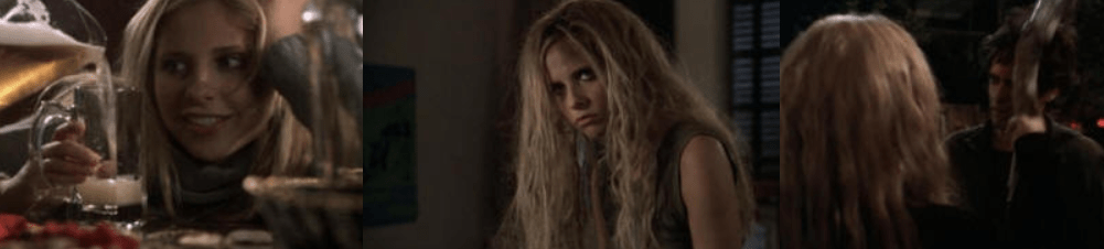 That night, Xander struggles as the bartender, finding it difficult to deal, when Buffy enters the bar, and while her eyes are fixated on Parker sitting with another girl, she runs into Riley. He tells her Parker’s bad news, and that he only uses a girl and then moves on to another one. An intelligent upperclassman makes fun of Xander and the fact that he’s nothing more than a bartender. Xander spots Buffy at the bar and tries to console her but must get back to work. On her way out, Buffy runs into another guy who, with the help of his friends persuades her to stay and drink with them. Seeing Parker leave with the other girl, Buffy accepts and ends up getting drunk with these very intelligent college guys.