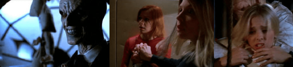 Willow and Tara combine their powers to move a vending machine in front of a door and protect them from the Gentlemen. Buffy gets caught by the Igor-like assistants and the Gentlemen are about to cut into her when Riley shoots them with bolts of electricity. They fight and one of the demons grabs onto Buffy as she spots a box on the table and recognizes it from her dream. She points it out to Riley and after one false try he smashes the box and everyone’s voices are returned to them. Buffy lets out a loud and long scream, which causes the Gentlemen to explode into a green slime. The following morning, Willow and Tara talk about being a Wicca, while Giles and Olivia talk about how many scary things are really out there. Riley goes to Buffy’s dorm to talk, but neither knows what to say.