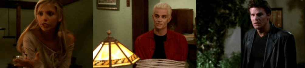 Angel makes his first reappearance in Sunnydale since he left town in Graduation Day (Part 2). Once Buffy finds out that he was sneaking around town, she leaves for Los Angeles and confronts Angel in that show’s I Will Remember You. When this episode first aired, it was immediately followed by the Angel continuation. Willow also queries Angel’s hiring of Cordelia.