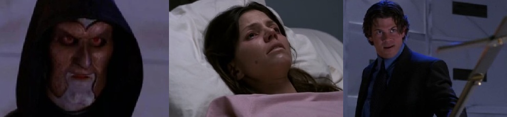 Wesley talks with Cordelia about Angel and how he’s cut off from life. Despite being evil and unwanted on the side of good, Vocah goes to the Oracles and kills them. Cordelia tries to find a hobby for Angel to keep busy with. Vocah follows her and after touching her hand, she gets a vision. The vision continues–never ending–as Cordelia collapses to the ground in agony. Angel reads up on the scrolls while the cloaked figure makes his way into the apartment.