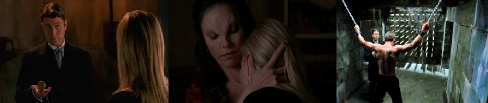 The valet presents Angel with his options, but Angel is willing to give his life, and that enough to pass the test. The valet gives Angel and Darla bad news though as it’s revealed that Darla is already living her second chance at life. Furious, Angel violently attacks the room that surrounds them, truly distraught that after everything he went through, he couldn’t save Darla. Upon returning to the surface, Darla is accepting of her fate and Angel is there to support her. Lindsey and several large men break into the room and restrain Angel and Darla. Drusilla makes a shocking return and while Angel watches, she makes Darla a vampire, again.