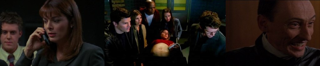 Darla’s contractions are still far apart, but the pain is the kind she doesn’t like and she wants the baby out. The gang discusses doctor options and agree that need access to medical equipment that will allow them to see what is actually inside of the vampire. Lilah and Gavin talk with a Linwood, whom Lilah has called to notify about Darla’s development. They discuss how no one at Wolfram and Hart saw it coming and that the Senior Partners need to be kept in the dark. Meanwhile, a spying Cyril makes a call to a Master Tarfall and informs him that the predictions were correct and the word must be spread to the others.