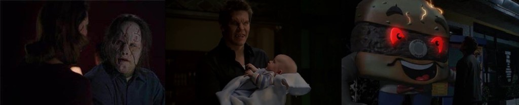Wesley follows a GPS unit to a precise location where he finds a hamburger speaker outside of a fast food place. He performs a ritual and the plastic hamburger comes to life, turning into what Wesley refers to as Loa. Loa confirms Wesley’s suspicion that Angel will “devour” his son and informs the man that the prophecy cannot be stopped. It predicts a future of betrayal and agony for Wesley. Loa finally reveals that when the earth shakes, the air burns and the sky turns to blood, the prophecy will come true. Lilah meets Sahjhan at a bar and ignores Sahjhan’s attempts at small talk to inform him that arrangements have been made to deal with their Angel problem.