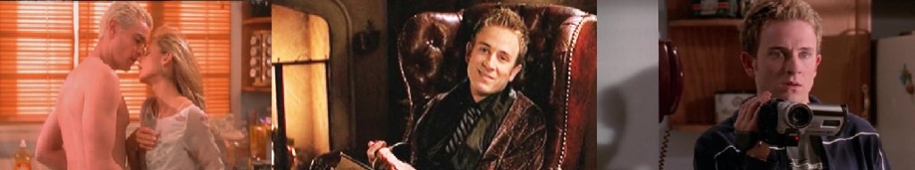Andrew, taking refuge in the bathroom, describes his own version of Buffy, Slayer of the “Vampyres” to a video camera (imagining that he is situated in an old library with a roaring fire, dressed in a smoking jacket and holding a pipe). His dramatic narrative of her exploits is cut short when Anya knocks on the bathroom door. He tries to explain his actions, and Anya is unsatisfied (reminding him of Buffy’s irritated reaction the previous night, when he had followed her on patrol). He explains his desire to make a record of the events leading up to the apocalypse, in case humans survive, so that they will know what Buffy and her allies did.