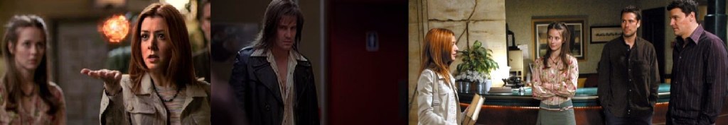 Connor shouts at Fred and Wesley about the need for killing Angelus, but before the others can really argue, Willow from Sunnydale appears at the door suggesting that she’s a better alternative. Willow meets with a cold reception from Connor, a shocked Wesley and a happy Fred. It’s revealed that Fred called Willow for help since she’s the only one to ever successfully restore Angel’s soul. Willow wants to see Cordelia again and Connor reluctantly takes her upstairs at Wesley’s prompting. Connor leaves the girls to talk alone and they catch up on their activities since they last communicated. Cordy and Willow talk about the difficulties associated with ensouling Angelus while Cordelia secretly reaches for a large knife under her pillow and tries to get Willow close enough to strike. All the talking gets Willow thinking and she realizes if they break the jar, they can avoid all the complications and free the soul. Willow rushes out of the room in time to avoid the knife thrown at her, which hits the door instead.