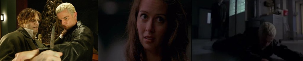 Spike returns to the lab, following flickering lights down the hall. He spots a young woman in nineteenth-century clothing – armless – who lunges at him before vanishing. Meanwhile, Angel settles in his apartment with a glass of blood when Spike materializes. Angel wants him gone, but Spike refuses to leave. The Shanshu prophecy comes up, and Angel dismisses it, saying all prophecies are false, and both of them are doomed to hell for their sins. They exchange jabs until Angel unexpectedly admits that he liked Spike’s poetry – while Spike mocks him for his fondness for Barry Manilow. Suddenly, Spike sees a man hanging from the ceiling – Angel, however, sees nothing.