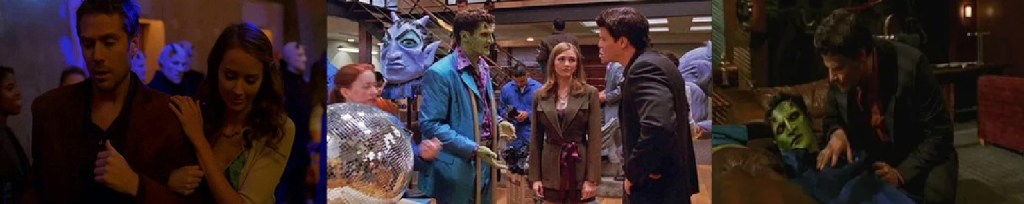 At Wolfram & Hart, the party begins with Harmony dancing alone under a mirror ball. Lorne mingles, encouraging employees to do the same. He greets a demon named Devlin, humorously disguised as a human. Fred and Wesley linger by the hors d’oeuvres, awkwardly admiring Lorne’s social skills. Lorne finds Angel watching hockey in his office and drags him to the party despite Angel’s complaints.