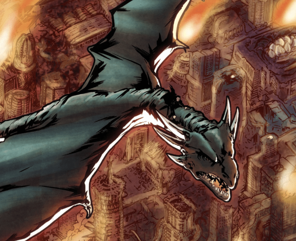 Los Angeles. A group of civilians are attacked by demons. Angel swoops in and stops the demons – with the help of the dragon he planned to slay. Turns out that the dragon was a slave, and it switched sides during the alley way fight. He saves the civilians, who are looting what’s left of a ruined shopping precinct. They ask Angel what’s happening, but he gives them a piece of paper, gets on the dragon’s back and flies away.
