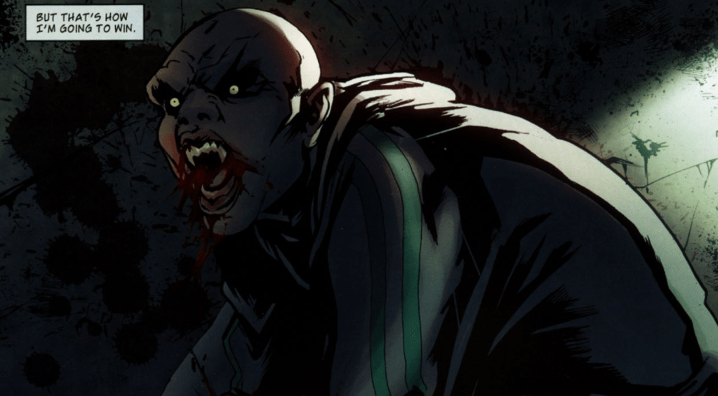 As the harsh moon-light shines on his fanged visage, Charles Gunn continues to feed…