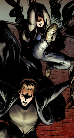 Connor tells Non he has back up coming. Spike thinks: he is just like his sodding father. Shut up and stab her! Non is delighted at the thought of killing the son of Angel. Connor prepares for her blow, but Spike strikes her down. He yells at Connor: “What do you think you’re doing? Get out of here!” Connor says he’s ‘helping the helpless.’ It doesn’t matter though – Non has recovered. She gets up and activates her powers, putting Spike down for the count. She grabs a hold of Connor – “Feed me!” she demands.