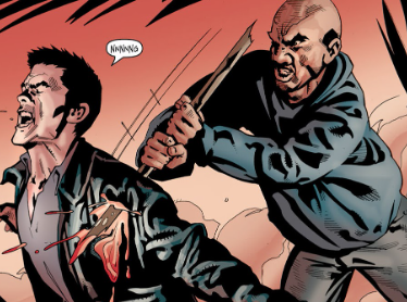 Wesley asks Angel if he’s recovered. Angel feels for a pulse: still human. But healed enough. He looks around for Connor, but Gunn comes out of nowhere, stabbing Angel through the chest with a large stake.