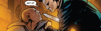 As people watch, Angel goes to where Charles Gunn is still on the ground. He picks him up by his hoodie – get up, he demands. He tells Gunn that his son is dead because of him, but he’s about to make it right. He attacks Gunn with a ferocity that takes all involved by surprise. The look of shock on Gunn’s face is palpable – Angel is trying to kill him. The Senior Partners and Spike both look up. The Partners demand that Angel stop what he is doing.