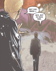 Wesley smiles at him. Yes. “They need to return to the very last moment before all this started. Exactly how it was. Exactly as we were.” Spike realises that that means Wesley will already be dead. He starts to fade away. “Yes,” he replies. “But so was she.” With that, he vanishes for the final time, telling Spike to take care of Illyria. Spike asks where the Hell he’s going and raises his arm to stop Wes.
