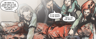 Angel ignores him, picks him up and tells the others that Gunn needs help or he’s going to die. Illyria declares that they can stop the rest. Angel suggests the Wolfram & Hart offices should still have the healing artefacts there, now that time has been changed back.