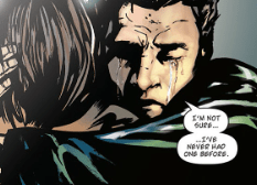 Angel steps outside and places his head in his hands for a moment, overwhelmed. He senses someone next to him: it’s Connor, alive and well, albeit with some rather horrific memories. Angel has no words. He pulls his son close into a hug. Connor asks him, as tears stream down Angel’s face, what it’s like to have a happy ending?