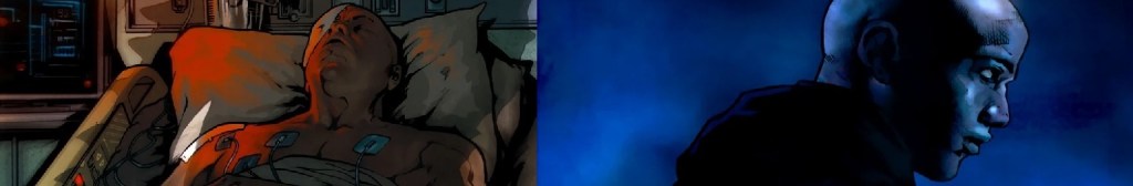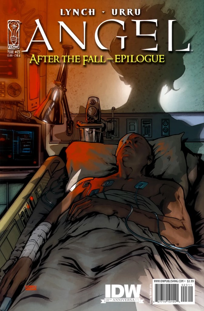 Weeks ago. A comatose Gunn has been brought to Silverlake by Lorne and his people, to be protected from assassins while he recovers from wounds he sustained in the battle in the alley way. While he’s unconscious, he’s vaguely aware of the many visitors that come into his room.