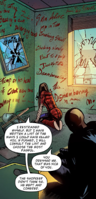 Betta George visits him. He finds non-Hell Gunn much less talkative than the one who kidnapped him. He knows of a place, for people like them. People who are supernatural and struggle with their place in society. Control their powers. Find solace from their guilt – things like that. It’s called Mosaic. He leaves the address in Charles’ head. He remembers more from Hell: stabbing Angel and realising he was human; nailing the vision-bearing demon to the wall. Horrors beyond his imagining. His worst nightmares.