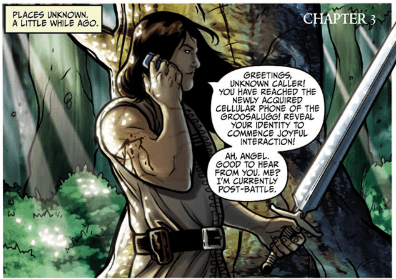 Not that long ago, in an unknown location, a cell phone rings in a small leather pocket. It’s the Groosalugg‘s latest toy and he’s finding it as easy to work as everything else that’s not medieval in this reality. When he answers it, he is surprised to hear Angel on the other end. Groo fills him in – he’s trying to stop some protestors who have befriended some tree-demons who want to reclaim their place on Earth. Groo is not being very effective – they’re simply waiting for him to leave. Groo is delighted when Angel asks him to travel to Vegas with Cordelia the dragon, to back up a mission. Groo’s face sinks when he discovers who he’ll be working with and warns Angel that ‘he’ had better not mock him again.