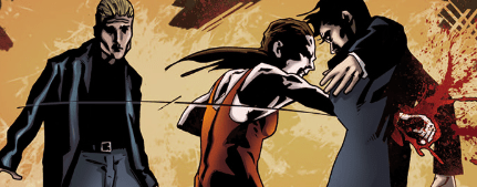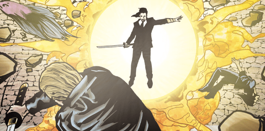 As Beck struggles to get up, John appears above her, katana ready to come down. He taunts her: “Remember your annoying bluster about Spike taking me down? How’d that go?” Beck simply points – as Spike comes from nowhere and attacks. He crushes the gauntlet on John’s wrist to prevent the same attack twice and tells him to shut up, stop playing the hero, and that he’s just a killer.