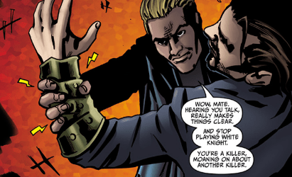 He knows they have to be stopped. Enough. He hits John with a left hook, knocking some teeth out. In fact, he almost kills him. Spike instantly steps back – remembering that his foe is human and that he’s not like that. He won’t kill him.