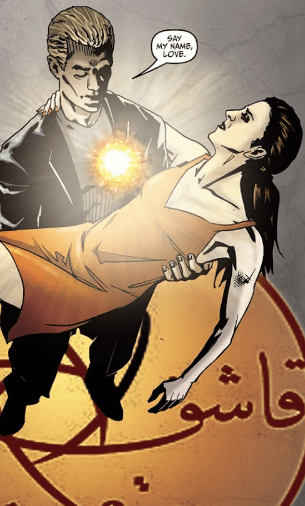 She looks at Spike and tells him to get in the rune circle. She just wants it out. He takes her in his arms, picks her up like he used to and tells her, softly: “Say my name, love”. As she says his name, the pair of them are enveloped in an unearthly glow, the spell of restoration transferring the soul from Drusilla back to Spike.