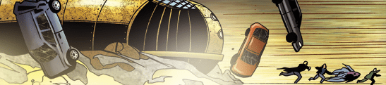 They run as the craft falls from the sky, like a pebble, and skids along the Strip, carrying destruction everywhere. As the craft stops with a thud, Spike and the gang look up at the vehicle. It’s massive, and slightly insectoid shaped. Beck asks Spike what they’re going to do now?