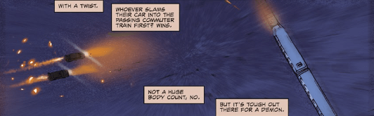 Or the San Fernando valley, in this case. There’s a drag race happening between some demons. The goal is to drive straight into a commuter train and inflict chaos and carnage. The winner is the one who hits the train first. Unfortunately, these demons were too busy checking their wing mirrors – and have failed to notice Illyria the Merciless in their path.