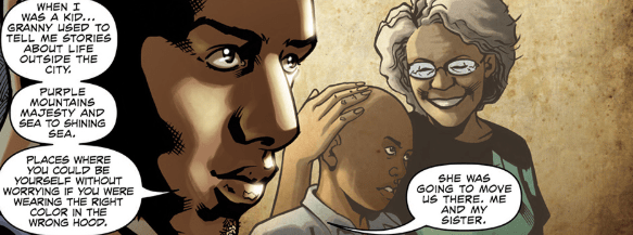 Instead he tells her a story about himself when he was younger. His grandmother used to tell him stories, about life outside Los Angles, where you didn’t have to worry about ‘wearing the right colour in the wrong hood’. It sounded like a fairytale to him, and his sister Alonna. They were going to move there with her, but it never happened. After his grammy had died, Charles learnt it had all been a story: his grandmother had never even left the city limits.