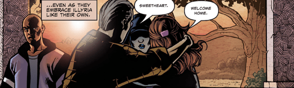 As they pull up to the Burkle residence, Gunn is waiting, expecting her to put on her disguise as Fred once more, but is quickly concerned when she doesn’t – how is he going to explain Illyria to Fred’s parents? When Trish and Roger come to the door, whilst they look visibly surprised at her appearance, they embrace Illyria regardless – unconditional love.