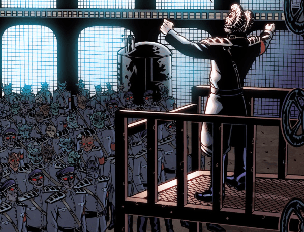 The two former Angel Investigations members arrive at the warehouse and find a way inside rather easily. They find Embre, atop an elevated platform, addressing hundreds of soldiers, all in the same ghastly Nazi-esque uniforms. Embre speaks to his troops, declaring that their time has come: finally, their saviour will rise and the impure will be cleansed from the face of the world in his fiery blaze!