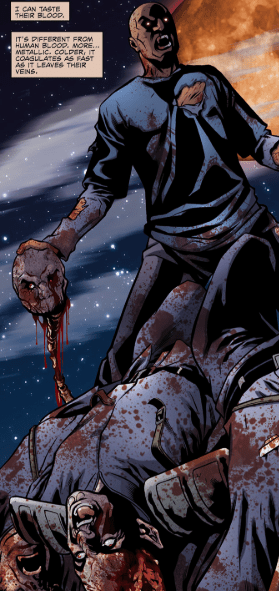 Okay, so he’s not a vampire anymore, Charles thinks, as the Scourge soldiers emerge from their vehicles. All wishful thinking, but he’s willing to bet that some of his Hell-A supernatural powers would come in useful right now. But he’s now human again, and it’s only him and his home-made axe that stands in the way of the Stygian slaughter that will keep Baticus in this dimension.