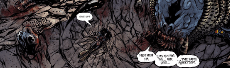 In the desert, Baticus is counting. Ninety-eight, ninety-nine, one hundred! It has been 100 seconds since Illyria has moved – he, Baticus, is the Slayer of Illyria the Merciless! Suddenly, his body starts to fall apart, what looks like small explosions, racking the Darque Wurm’s form. Gunn can hear him screaming from the barn.