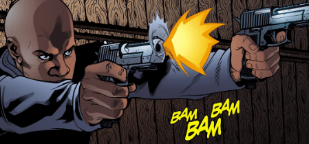 As soon as their weapons are down, Gunn smiles. “Too funny,” he grins, as he pulls two handguns from his waistband and takes out seven soldiers with head shots, in seconds! By the time their leader has gone for a weapon, Gunn has swung his axe, and the threat is over. Demons 0, Charles Gunn 8. And the winner takes it all.