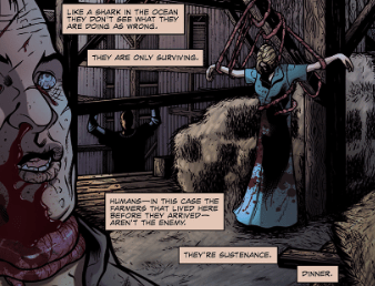 Gunn knows as soon as he gets back to the barn. He defended the Stygian because they were innocent. They were. They just lived their lives. But as Gunn looks at the human bodies, the farmland’s owners, half eaten, he knows he’s made a mistake. It’s their natural life cycle.