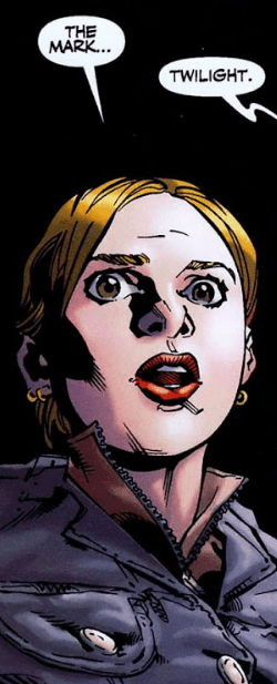 Ethan’s body is slumped to the ground, a bullet wound in his head. It’s Voll, who’s just executed his prisoner. As Buffy throws him against the nearest wall, his shirt opens, exposing the symbol – the beautiful sunset – on his chest. The mark he says, is called Twilight.