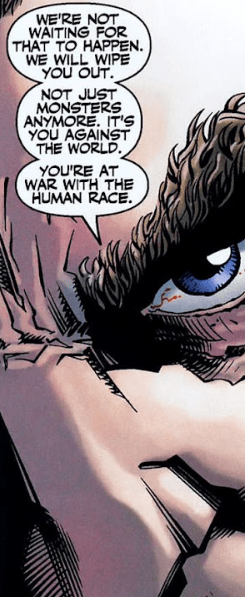 He looks Buffy straight in her eyes as he continues. “You’ve upset the balance, girl. Did you really think we were going to sit by and let you create the master race?”