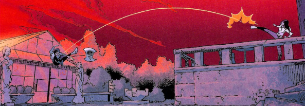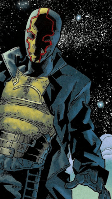It’s a man, in a long black coat. Lots of black leather, shiny black boots and a leather mask over his face. He floats down from the air to talk to the soldier. She tells him he’s not going to be happy with the end result: Genevieve Savidge and Roden are dead.