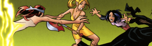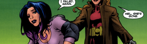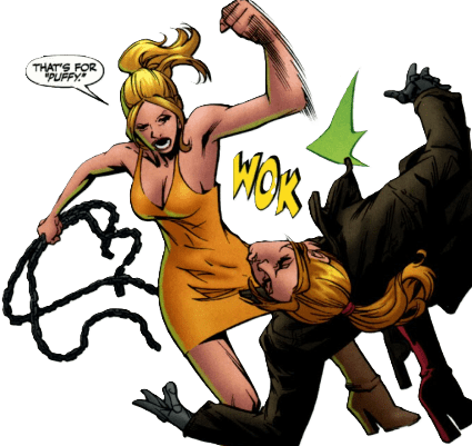 Buffy launches herself skyward, toward Melaka. The battle gets more ferocious with every blow, Mel’s boot smashing against Buffy’s head.