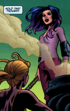 Mel swings her Scythe around her arm, battle ready. She already told Willow that she wouldn’t kill Buffy, but Willow uses the fact that if Buffy goes back, Melaka will simply cease to exist. Mel questions her, tells the madwoman she’s lying, but Willow confirms that she is lying, to someone. “Would you bet your whole world it’s you?”
