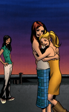In the 21st Century, on the Manhattan balcony, the morning sun is rising. Willow removes her blindfold, convinced that she was grabbing the wrong person, but is relieved it’s Buffy. Buffy has tears streaming down her face, the reality of what has just happened, deep on her soul. I killed Willow in the future. I will be her end. She wraps her arms tightly around her best friend. “I love you, Will,” she shares tearfully, before Willow pulls her into a hug, a nervous Kennedy watching their every move.