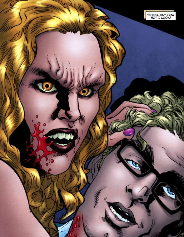 Harmony manages to land on her feet, cursing her ankles and raises herself and the makeshift stake up, ready for an incoming attack. The Slayer leaps off the balcony towards Harm, ready to continue their fight – but lands on Harmony’s clapper board, impaling herself on it’s end. Harmony, figuring that Slayers would really tank her ratings, bites the Slayer and feeds off her, live on air.