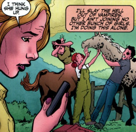 Buffy is watching as Xander and Willow desperately try to keep centaur Dawn from being mounted by an amorous young buck. The girl hangs up because she’s heard Buffy’s words about family and sisterhood before. She walks away from Andrew – she’s done it before and has no interest in joining what she sees as another gang of thugs.